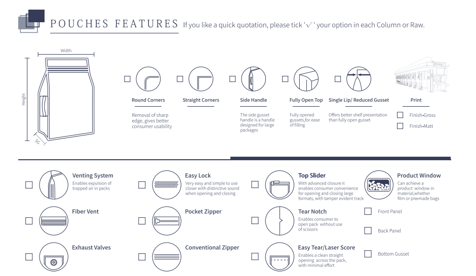De perfecte balans tussen verpakkingsvorm en functie. Van traan inkepingen, toren en klittenband/aplix® -systemen, de verscheidenheid aan functies die beschikbaar zijn met zakjes is eindeloos