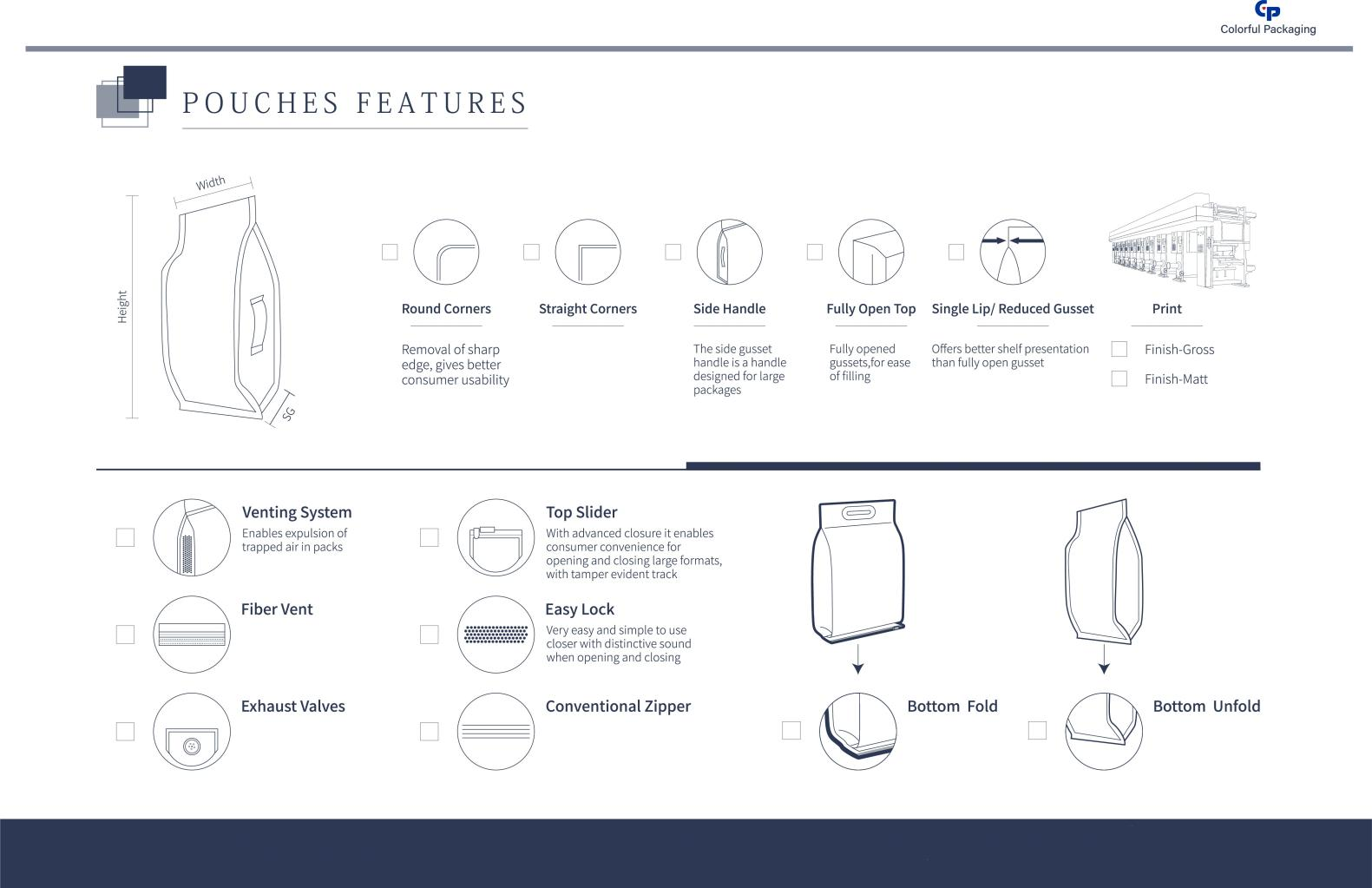 Ritssluiting, helder raam, traan inkeping, tuit, zijhandgreep, ontgassingsklep, hanggat, etc.